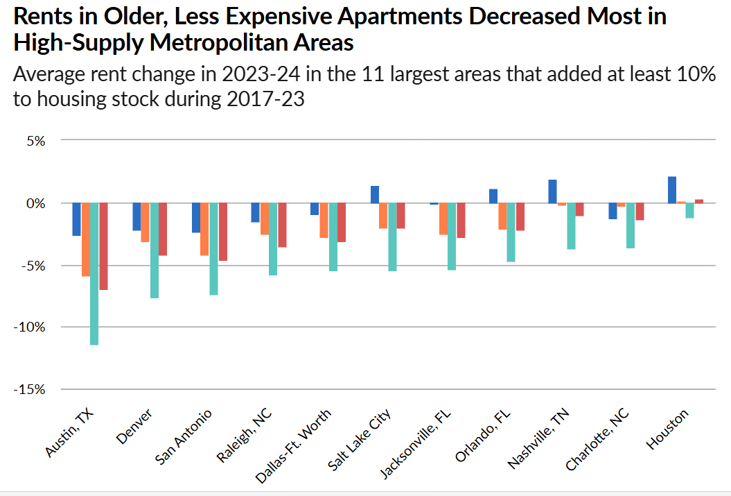 As supply has increased, rents have begun to dip as well, according to a new report from Pew. The steepest rent declines were for units in older and less expensive buildings. Even though most of the new apartments and condominiums built were not subsidized and may have had higher rents than low-income residents could afford, the new supply helped push rents down in older, less-expensive units by reducing the competition among those seeking homes that were no longer as scarce.